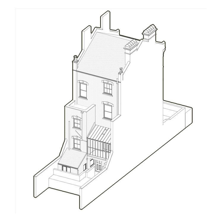 A mid-terrace Victorian house within a conservation area required additional accommodation and full refurbishment. The rear solarium leaked and caused mould, and the existing rear outrigger stopped at first-floor level, leaving upper levels without a nearby bathroom.