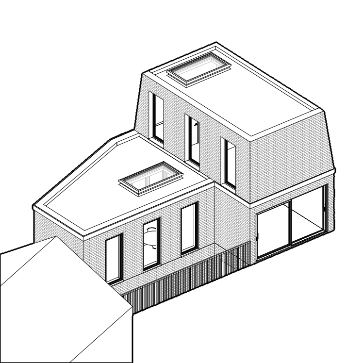 The plan stacked bedrooms at basement level around a lightwell, placed the main living/kitchen and entrance stair on the ground floor, and located an additional bedroom at first floor within a reduced upper volume. Parking sits at the track edge, separating arrival from the rear garden.