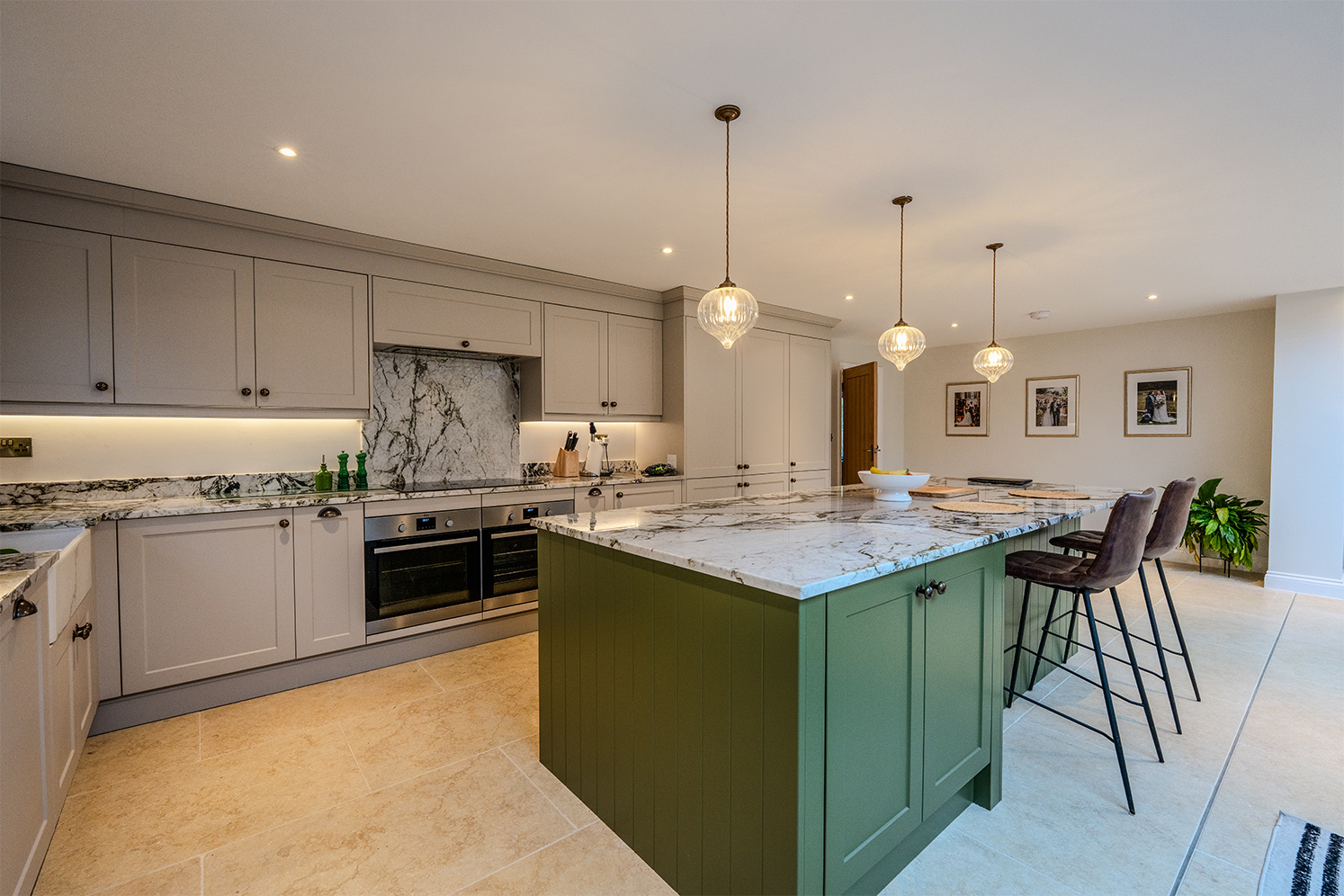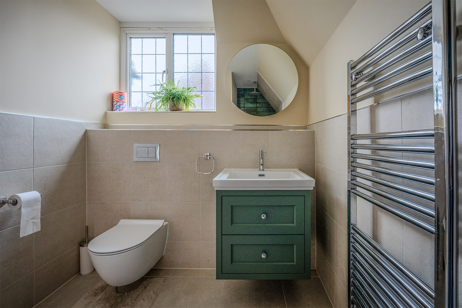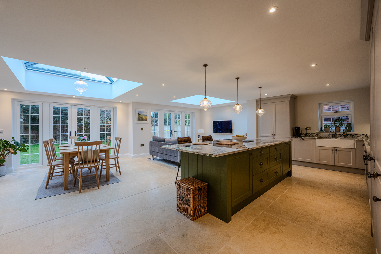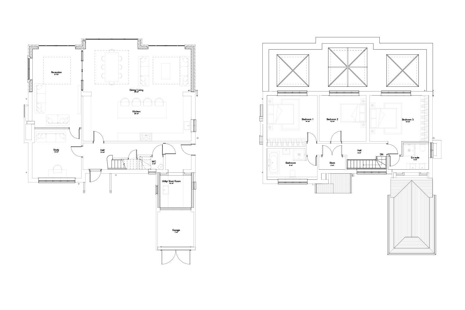 A rear extension was developed to consolidate kitchen, dining and living functions into a single open-plan room, while retaining a separate reception and adding a study and utility/boot room off the hall. Four façade and rooflight options tested rear elevation composition, parapet treatment and lantern layouts.