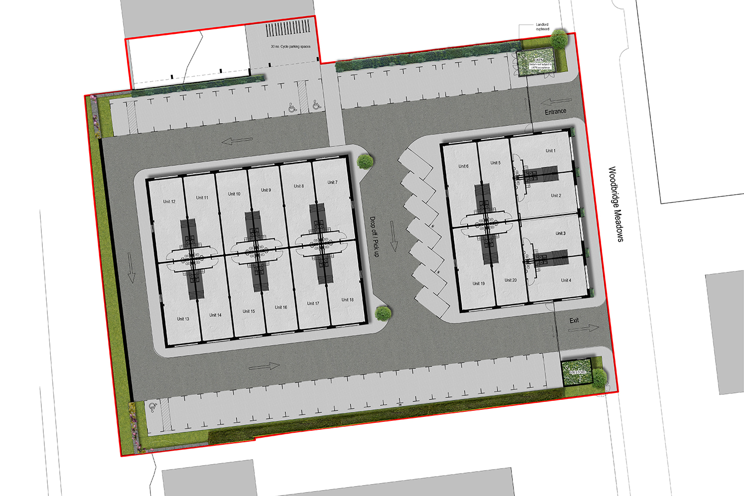 A two-storey mass was split into two blocks to avoid the Thames Water easement, forming 20 units in two typologies: outward-facing units to the street and back-to-back units to an internal road. A one-way perimeter route organised parking, a delivery layby and the cycle store, bin store and substation.